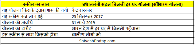सहज बिजली हर घर योजना (सौभाग्य योजना) गरीब लोगो के लिए प्रारंभ की गयी।