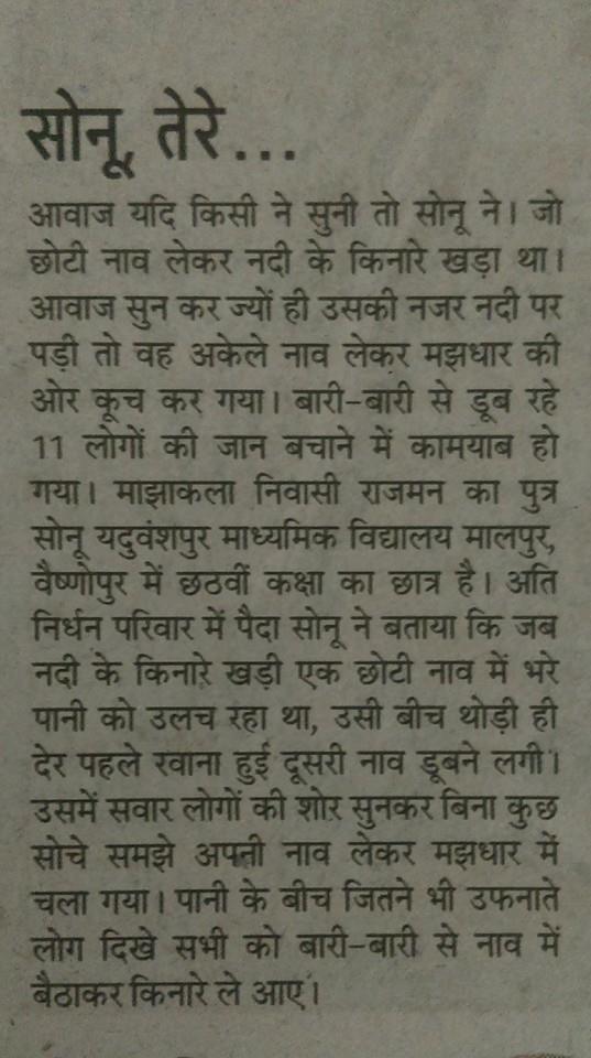 कल हमारे बस्ती जिले मेँ घाघरा नदी मेँ करीब 40 लोग से भरी हुई १ नाव पलटने से 11 लोगोँ की मृत्यु हो गई परंतु कक्षा 6 मे पढने वाले एक बच्चे ने 12 लोगोँ की जान बचाई | यह निश्चय ही साहस एवं वीरता का परिचय हेँ ।