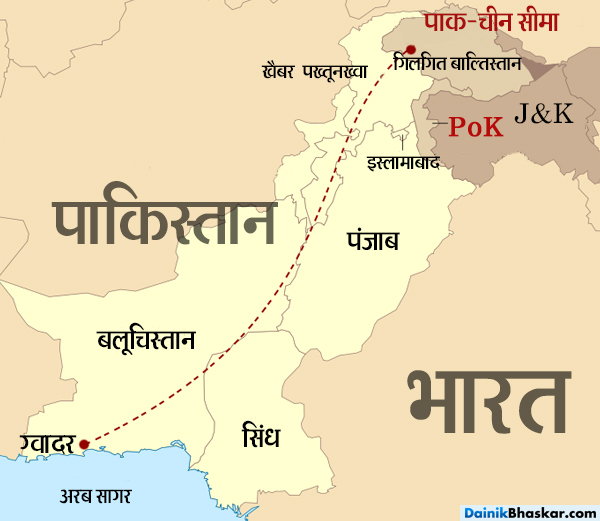 CPEC के तहत पाक के ग्वादर पोर्ट को चीन के शिनजियांग को जोड़ा जा रहा है। इसमें रोड, रेलवे, पावर प्लान्ट्स समेत कई इन्फ्रास्ट्रक्चर डेवलपमेंट किए जाएंगे।