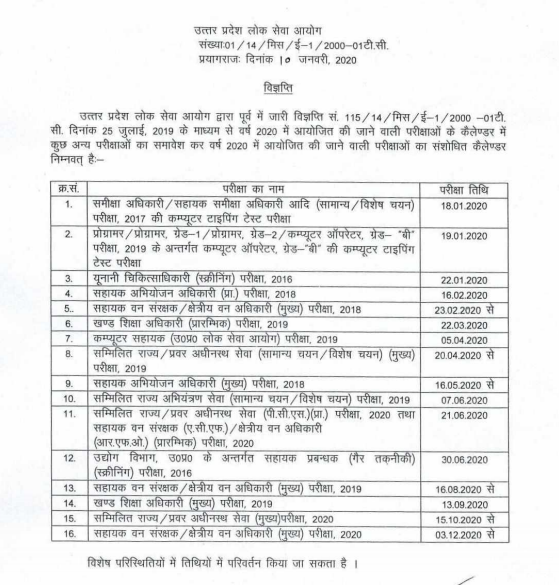उत्तर प्रदेश लोक सेवा आयोग द्वारा पूर्व में जारी विज्ञप्ति सं. 115,/14 / मिस / ई-1 / 2000-01 टी.सी. दिनांक 25 जुलाई, 2019 के माध्यम से वर्ष 2020 में आयोजित की जाने वाली परीक्षाओं के कैलेण्डर में कुछ अन्य का समावेश कर वर्ष 2020 में आयोजित की जाने वाली परीक्षाओं का संशोधित कैलेण्डर निम्नवत् है:-